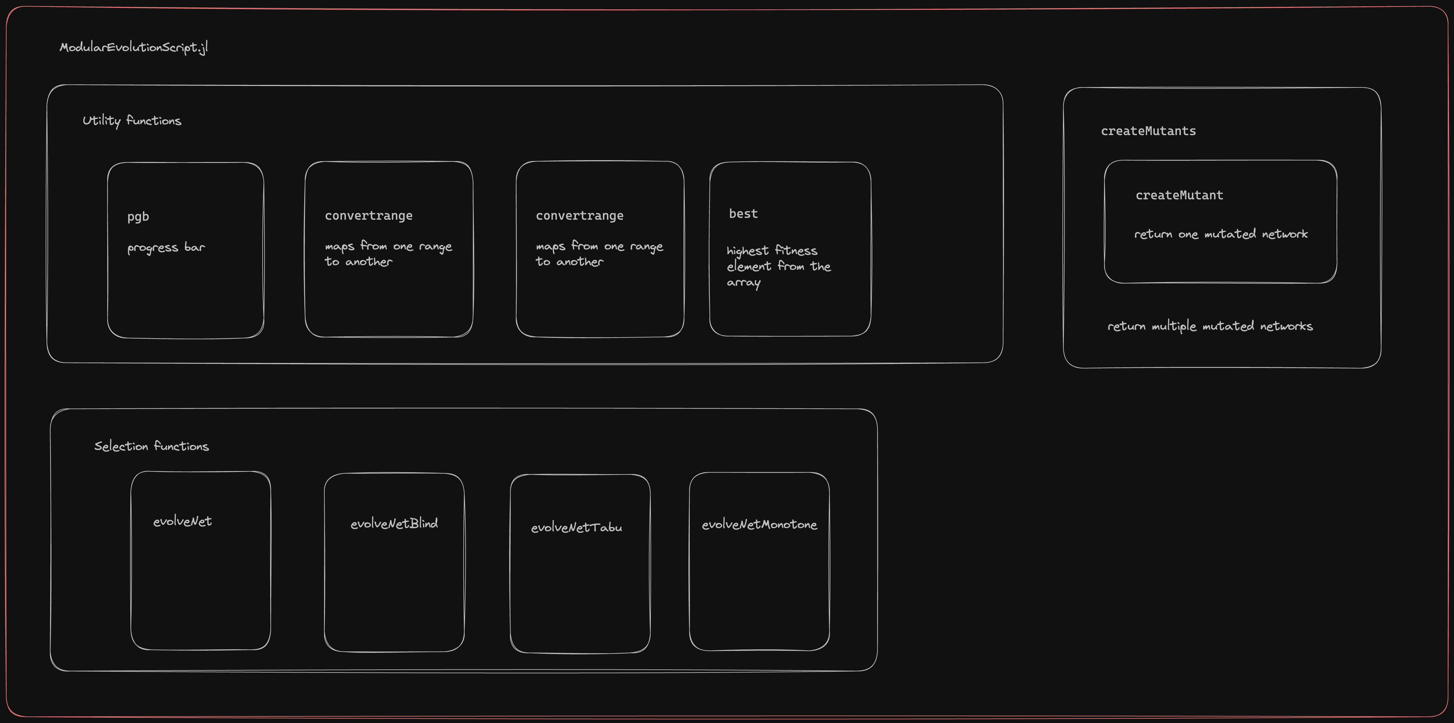 evolveNetBlind: Generates mutants at each iteration, selects the best one. No memory of what networks have already been seen. (Likely to get stuck in local optima).